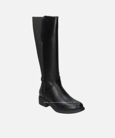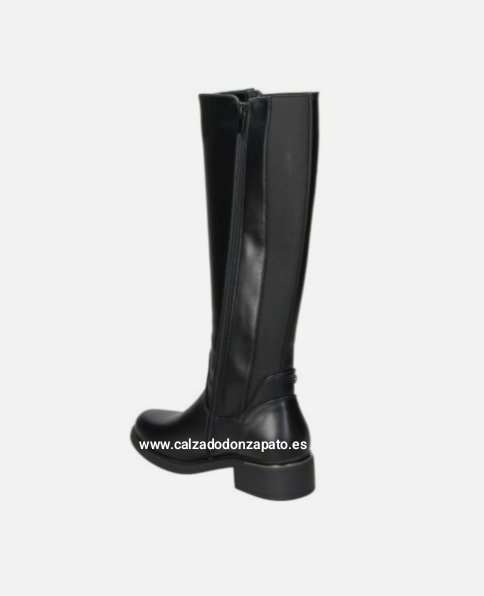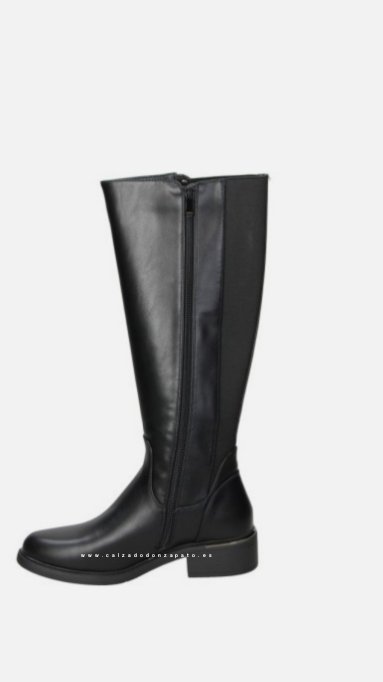 Bota diseñada en color negro de polipiel,parte trasera con elásticos y cremallera lateral.