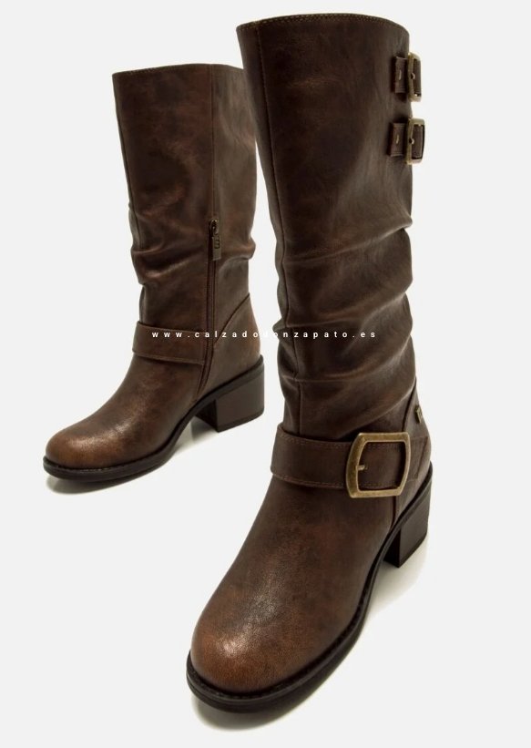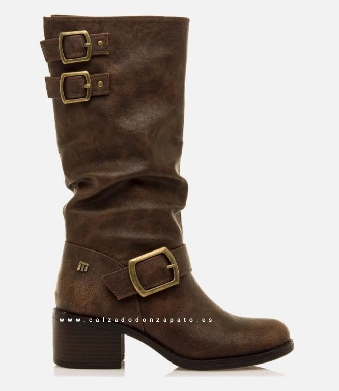 Bota Mustang mujer marrón modelo Persea de estilo biker. Diseño de caña media, incluye tres hebillas decorativas en tono dorado, tacón ancho