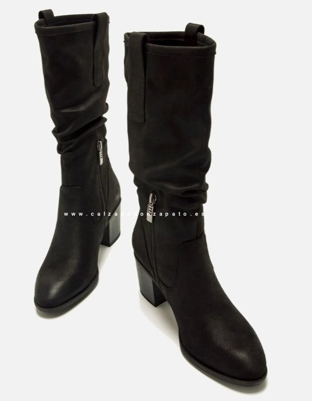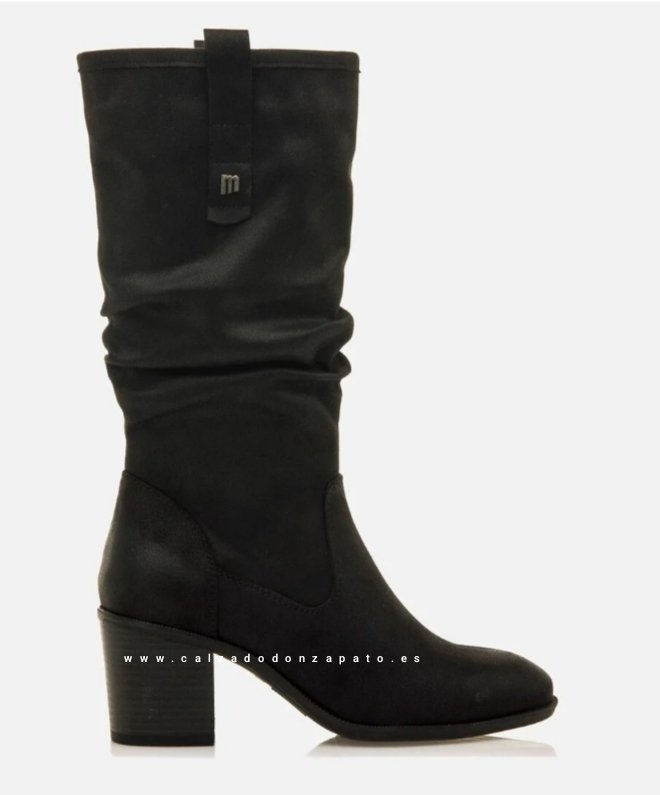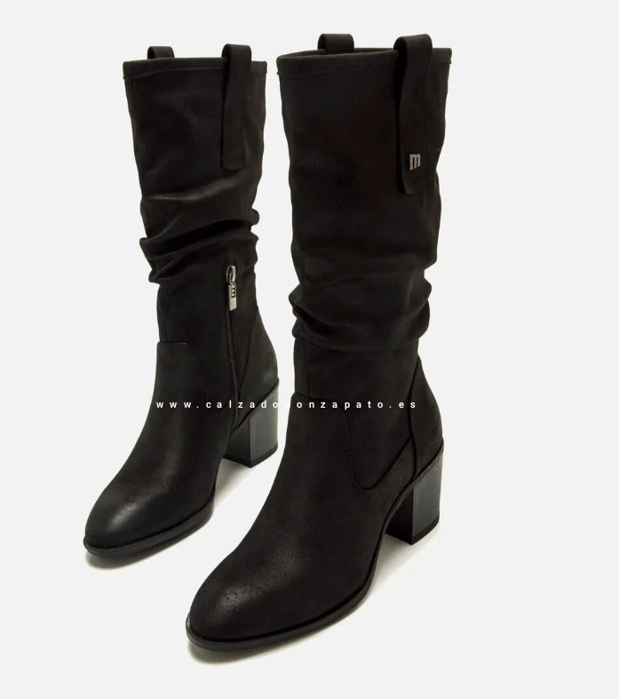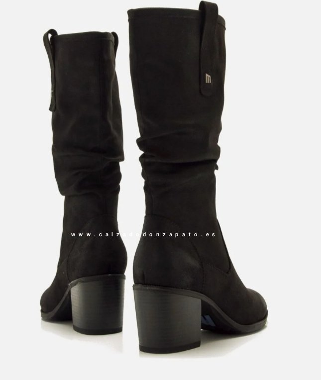 Bota mujer Mustang negra de estilo campero. Caña alta con tacón ancho y acabados arrugado en la parte superior, ideal para el día a día.