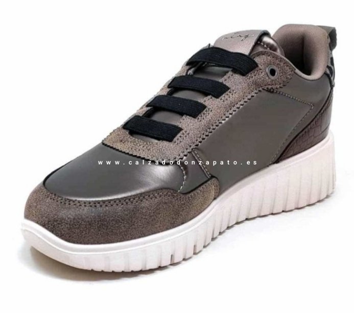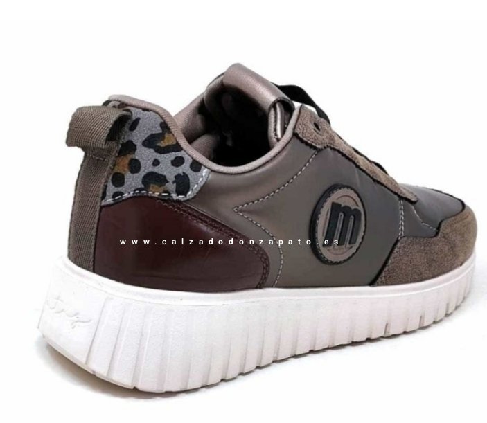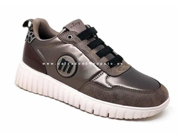 Deportivo señora mustang tabaco con un diseño moderno casual. Combina varios texturas y adorno leopardo en el talón. Cierre cordón elástico.