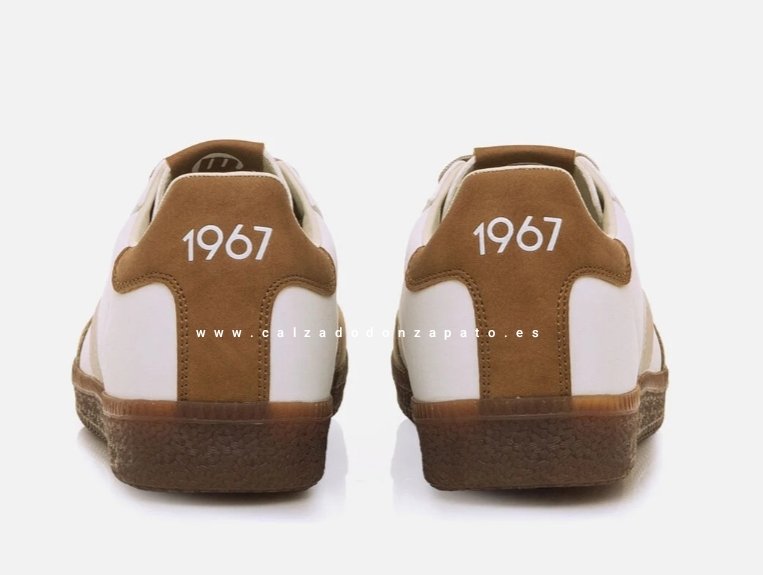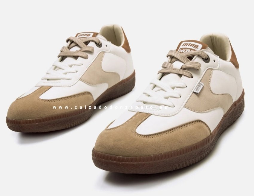 Zapatillas Mustang retro hombre blancas y beige 84775. Combina piezas en acabado tipo ante en la puntera, lateral y talón, aportando textura y contraste visual. Suela tono caramelo refuerza el carácter clásico del modelo.