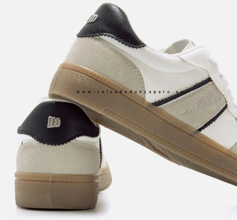 Zapatillas Mustang mujer blancas con detalles beige y negro, modelo ROY de diseño casual. Combina paneles de texturas de texturas suaves y un toque retro, suela de goma en tono caramelo.