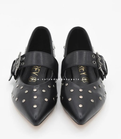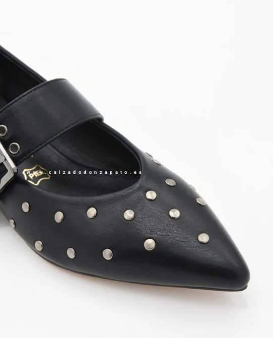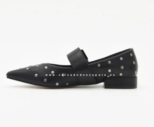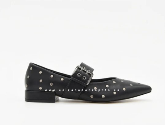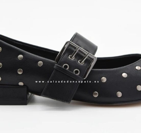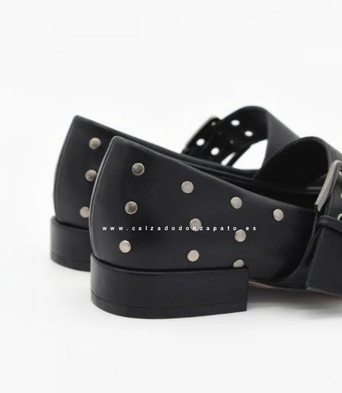 Bailarina negra tipo Mary Jane reinventa el calzado plano con una estetica contemporánea y auraz. Decorada con unas tachuelas metálicas en acabado plata, hebilla ancha con buena sujecion. Tacon bajo cuadrado.